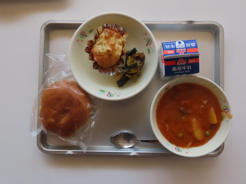 本日の献立は、こめこいりかぼちゃパン、ミネストローネ、さけのグラタン、手づくりデザートでした。