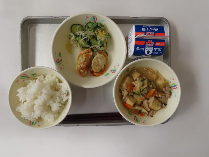 きょうの献立は、むぎごはん、チャージャンどうふ、ひごギョーザ、みずなとじゃこのサラダでした。