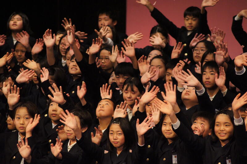最後は、5年生全体での合唱。曲は「おりづる」「きみをのせて」で