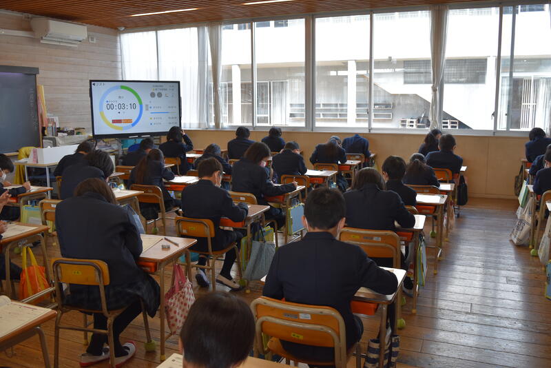 テストは、先生の説明をしっかりと聞いて、どの学年も集中して問題に取り組んでいました。明日も残りの教科が行われます。自分の実力を出し切って精一杯がんばってほしいです。