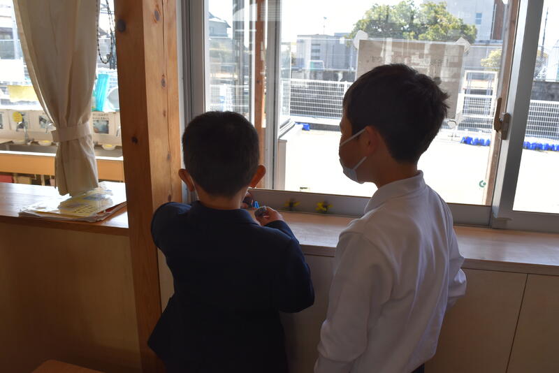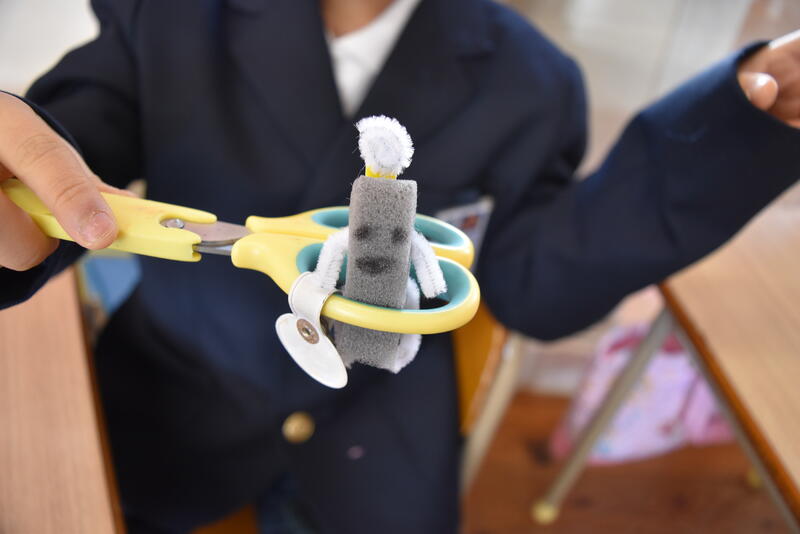 2月25日(金)、1年生は「すきまちゃんの すきな すきま」という単元の授業をしていました。子どもたちは、作ったすきまちゃんを持って、身の回りの隙間をたくさん見つけていました。「先生、こんなところにも隙間があります。」と、すきまちゃんと一緒にタブレットで写真を撮って笑顔で楽しんでいました。