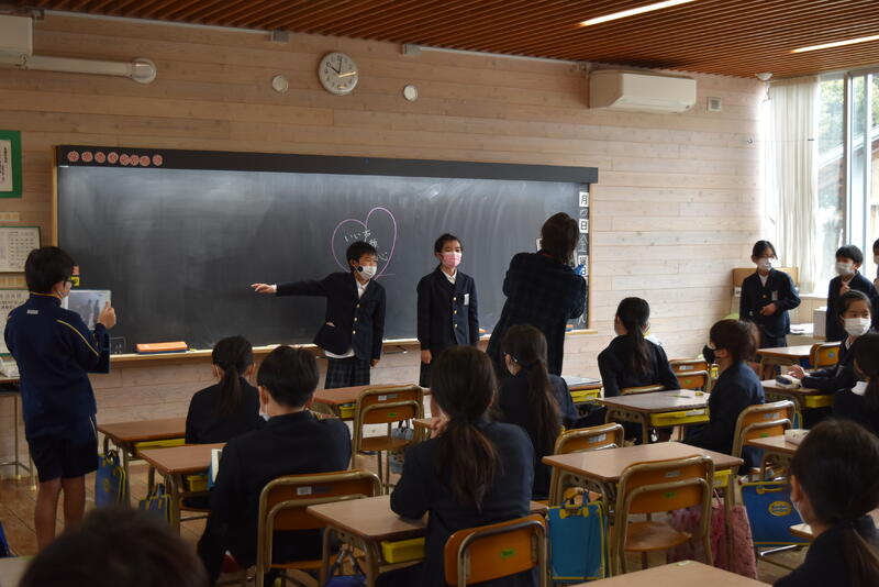子どもたちは、将来の夢や日本のことについて発表したり、疑問に思ったことを質問したりして、それぞれの国の人たちと英語でのコミュニケーションを楽しんでいました。英語が分からないときには、鹿本高校のグローバル探求コースのお兄さん・お姉さんが優しく教えてくれました。また、平小城小や三岳小の友だちも山鹿小に来て一緒に交流することができ、充実した国際理解教室になりました。