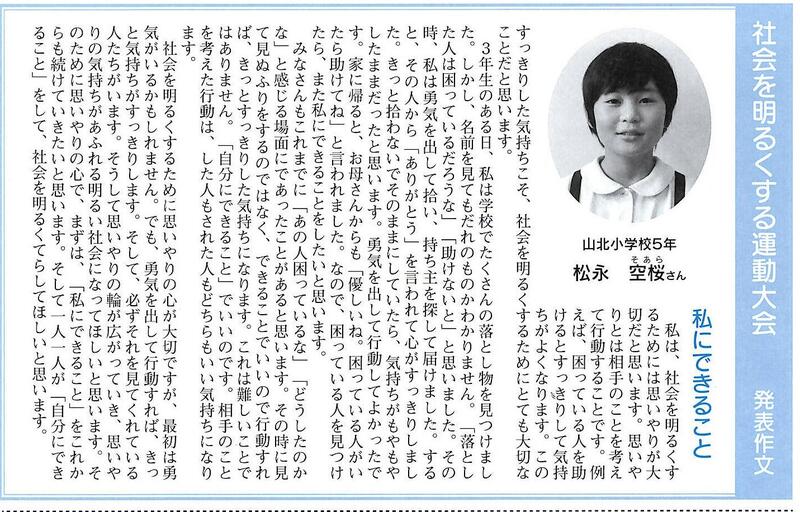 また、「玉東町 社会を明るくする運動大会」で発表した5年生のそあらさんの作文が掲載されました。
