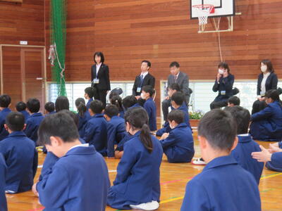体育館で、温かい思いの詰まった退任式が行われました。4名それぞれが大好きな山北小学校の子どもたちへの思い出等を話しました。子どもたちは、時には涙ぐんだり、うなずいたりしながらしっかり話を聞いていました。