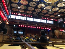 八千代座に来ました。まず、係の人から八千代座の歴史や建物の作りについてお話を聞きました。その後、八千代座の中を見学して周り、舞台で花吹雪を浴びたり、回り舞台を回してみたりしました。