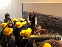田原坂西南戦争資料館に着きました。前半は資料館の係の方から西南戦争の概要や使用された武器等、田原坂の戦いの状況の説明を聞きました。後半は玉東町教育委員会社会教育課研究員の宮本先生にお越しいただき、二俣台地の砲台跡や横平山・吉次峠戦場跡など玉東町内にある西南戦争ゆかりの史跡等について説明を聞きました。