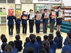 校長の講話の後、多読賞(貸し出し・貯頁)の表彰を行い、代表の児童に賞状と賞品を渡しました。
