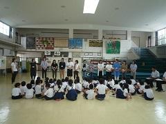 その後、玉名郡市水泳記録会に出場した11人の児童を紹介や校歌斉唱等を行いました。