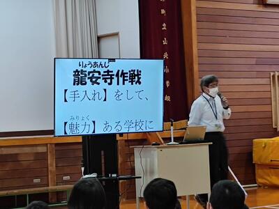 今日の「後期始業式」では、藤本校長先生が「龍安寺(京都)」の手入れを例に挙げられ、「山北小学校をほこれる学校にしたい」という話をされました。現在、山北小には13人のボラティア部員(校長先生が募集されました)がいます。落ち葉はきなどをしてくれて、学校がきれいになっています。「手入れ」の輪が広がり、「誇れる山北小」にしたいですね。