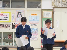 21日(金)の業間に冬休み前集会がありました。校長からは、年末年始の伝統的な行事や習慣等をたくさん経験してほしいという趣旨のお話をしました。その後、4人の代表の児童から後期前半の反省と冬休みの目標についての発表がありました。