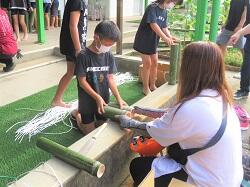 最初にさとうきびについての説明をしていただきました。その大きさに子供たちは驚いた様子でした。続いてさとうきび絞り体験です。さとうきびの茎を機械にかけ、汁を絞りました。絞った汁はさとうきびジュースとしてゴクリ。とっても甘くて濃厚でした。