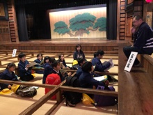 八千代座に来ました。まず、係の人から八千代座の歴史や建物の作りについてお話を聞きました。その後、八千代座の中を見学して周り、舞台で花吹雪を浴びたり、回り舞台を回してみたりしました。
