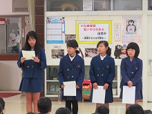 21日(金)の業間に冬休み前集会がありました。校長からは、年末年始の伝統的な行事や習慣等をたくさん経験してほしいという趣旨のお話をしました。その後、4人の代表の児童から後期前半の反省と冬休みの目標についての発表がありました。