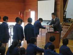 校長の講話の後、多読賞(貸し出し・貯頁)の表彰を行い、代表の児童に賞状と賞品を渡しました。