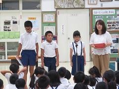 昨日(9月1日)に3年生担任の川口先生の退任式を行いました。川口先生は、お休みされていた山王堂先生の代わりに4月1日から昨日まで本校に勤務されていましたが、山王堂先生の復帰に伴い、ご退任されることになりました。大学卒業したてで、学習指導や学級経営も全てが初めての経験の中、若さと誠実さで子供たちの教育のために精一杯励んでこられました。子供たちとの触れ合いをとおして川口先生ご自身も一回り大きくなられたのではないかと思っています。川口先生、大変お世話になりました。