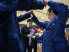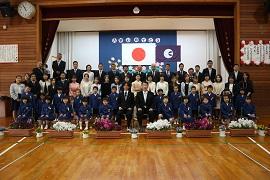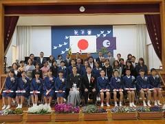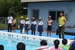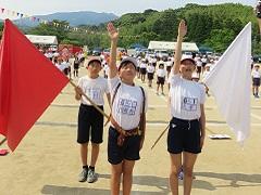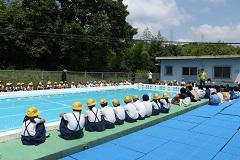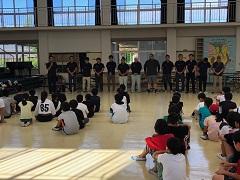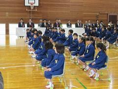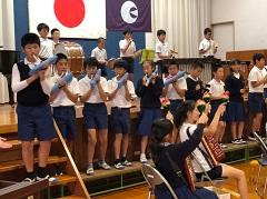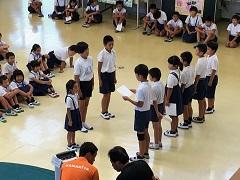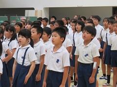 その後、玉名郡市水泳記録会に出場した11人の児童を紹介や校歌斉唱等を行いました。