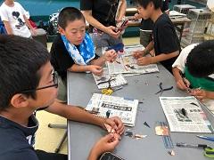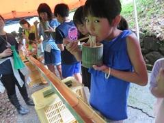 本年度は、残念ながら雨のため「川遊び」の活動は中止しましたが、前日から多くの保護者の皆様に雨の日用のプログラムに合わせた準備をしていただき、マイ竹カップ・竹はし作り、竹とんぼ作り、火起こし、パチンコ、ビザ作り、流しうどん等の活動を無事行うことができました。
