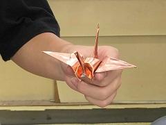 内容は寿司作りと銅板金による折り鶴作りで、2グループに分かれて前半後半で両方とも体験しました。寿司作りの方は、初めに作り方の手本を見せてもらい、巻き寿司とにぎり寿司をそれぞれ作りました。鶴作りの方は銅板を型紙合わせて切って折り曲げて作りました。出来上がった銅板折り鶴は、修学旅行に持って行き長崎の平和祈念公園にお供えする予定です。