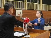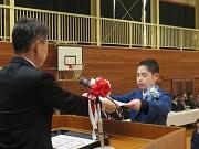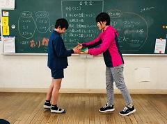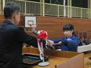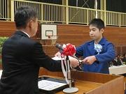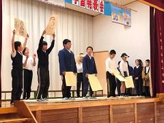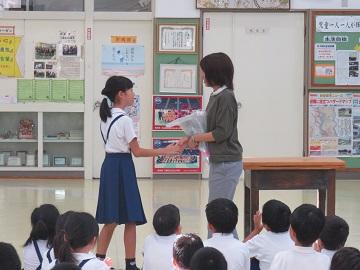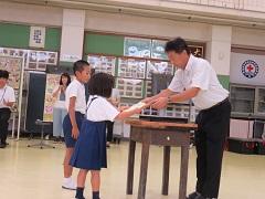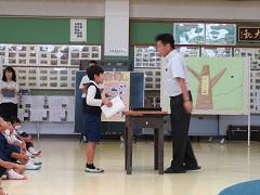 校長の講話の後、多読賞(貸し出し・貯頁)の表彰を行い、代表の児童に賞状と賞品を渡しました。