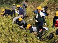昨日(10日)の2、3時間目、5・6年生は稲刈りを行いました。子どもたちは手刈りでどんどん刈っていき、例年であればバインダーを使った収穫も体験するのですが、本年度は先日の台風で稲が倒れているので、元PTA会長の清田勝男さんにお任せしました。刈った稲はかけ干しにしました。聞いた話では、逆さに吊すことで栄養をお米に行き渡らせるとか。当日は5・6年の保護者の方にもたくさんご協力・ご指導をいただきました。「山北ってすごいところだな!」と改めて感じています。