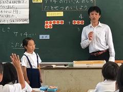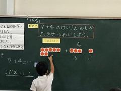 本日(10月21日)の5時間目、1年生算数の研究授業がありました。授業は、1位数+1位数の繰り上がりのあるたし算の計算の仕方を説明する内容でした。担任の松井先生は、数図ブロックの操作させながら、「まず」や「つぎに」などの言葉で順序立てて説明させる工夫などを行い、子供たちが「主体的・対話的」に学んでいくよう仕込んだ授業にチャレンジし、子供たちもそれに応えようと一生懸命頑張ってくれました。
