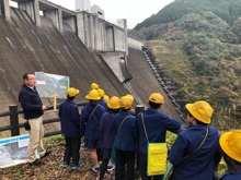 竜門ダムに来ました。まず、竜門ダムについてのDVDを視聴した後、ダムを管理する国土交通省の職員の方からジオラマ等を使ってダムの構造やダムの水の取水方法、ダムの水を利用する地域などの説明を聞きました。その後、ダム内部のトンネルを通ってダムの下の方へ降り、ダムの大きさを体感したりしました。