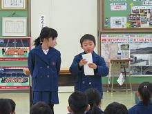 本日(11日)の業間は、第2回目の児童集会がありました。今回は生活委員会と放送委員会からの発表でした。生活委員会からはあいさつ運動の紹介や名札をきちんと着けている学年の表彰等があり、放送委員会からは「ありがとうメッセージ」の朗読と呼びかけ等がありました。