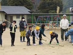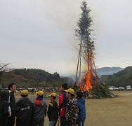 1月12日(土)に、本校の伝統行事「どんどや」がありました。前日からの雨が少し心配でしたが、開始時間には雨は上がり予定通り実施できました。開会式の後、まず「もぐらうち」をしました。「13日のもぐらうち、14にちのどんどや、15日のごしょうき」と声をかけながら、地面をたたきました。その後、点火式となり、やぐらは見る見るうちに燃え出しました。書き初めの習字も天高く舞い上がり勉強の運気も上がったことでしょうし、竹のパンパンを割れる音が厄払いになったことと思います。やぐらの組み方がいよいので、思ったよりはやく燃えてしまい、できあがった「おき」で思い思いにお餅を焼いて食べました。