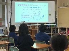 2年生用の題材は「うさぎさんのごめんなさい」で、「『ごめんなさい』の気持ちを相手に伝えることの大切さを知る」というねらいのコミュニケーションスキルを身に付ける学習でした。教育相談員の藤本先生、保健室の田﨑先生、担任の松井先生のチームティーチングで実施していただきました。