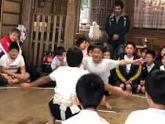 今日の3・4校時、5・6年生は白木八幡神社の宮相撲に参加しました。あいにくの雨で、境内の土俵で相撲をとることができませんでした。その代わり、本殿に作った仮の土俵で行いましたが、ケガの心配もあったので、「押し相撲だけ」でというルールで行いました。しかし、土俵際まで押されたら、自然と投げ技を出したくなるものです。行司の北原先生も軍配をどちらに上げるか苦労していたようです。5・6年生の男子は、個人戦、勝ち抜き戦、代表戦を行いました。これは奉納相撲ですので、五穀豊穣や無病息災等を祈願することが目的ですが、子供たちがしっかりお祭りを盛り上げてくれたので、参拝に来られた地域の皆様をたくさんの笑顔にすることができました。世の中にはいろんな考えがあり、人々の価値観も時代と共に変化するのかもしれません。しかし、伝統文化を守ることはやはり大切なことなんだと再認識しましたし、子供たちもその一端を担ったことに誇りをもってほしいと思いました。