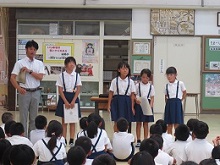 校長の講話の後、多読賞(ニコニコ文庫)の1位(88冊)の6人(2年しおん君、3年つきなさん、ひかる君、こうしん君、とうま君、4年わかなさん)の表彰(代表:わかなさん)も行いました。