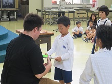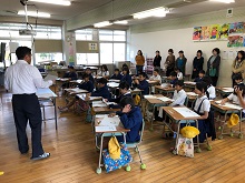 本日の校内研修では、池田教諭が中堅教員資質向上研修も兼ねて、外国語活動の公開授業(研究授業)を行いました。玉東中から英語の先生2人、ALTのジョー先生(T2として授業を実施)とバレリア先生、木葉小から香山先生、さらに玉東町教育委員会の担当の方にご参加いただきました。研究授業は、What's this? It's ○○. にゲームやクイズを通して慣れるという活動内容で、5年生はとても楽しそうに参加していました。授業研究会では、平成33年度の新学習指導要領の完全実施に向け、中学校の先生と有意義な意見交換ができました。すべての外国語活動(英語)の授業にALTに入っていただいている玉東町の恵まれた教育環境を再実感するととも、子どもたちのためこのような小中連携の機会をたくさん作っていきたいと思いました。