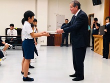その後、玉名郡市水泳記録会に出場した4人の児童に記録証を授与しました。