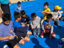 伝承遊びの活動にうつりました。竹とんぼ、竹馬、竹笛、あやとり、お手玉等、地域の方に教わりながらやってみました。私(校長)は、メンコに入って一緒に遊びましたが、つい「昔取った杵柄」を見せてしまい、子供たちから「大人げない」と言われてしまいました。