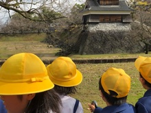 二の丸公園に着きました。記念撮影の後、昼食になりましたが、途中雨がザーッときたので、弁当の残りはバスの中で食べました。その後、雨があがったので、熊本城の地震の被害と復興の状況を見学しました。