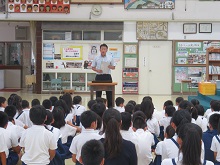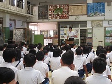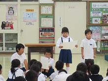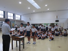 校長の講話の後、多読賞(ニコニコ文庫)の1位(88冊)の6人(2年しおん君、3年つきなさん、ひかる君、こうしん君、とうま君、4年わかなさん)の表彰(代表:わかなさん)も行いました。