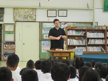 今日の全校集会では、ALTのジョー先生の交代式を行いました。ジョー先生は後期から木葉小に勤務され、代わりに木葉小からバレリア先生が来られます。ちょっと寂しい気持ちではありますが、これはあくまで「交代」で、来年度以降、再びジョー先生と外国語活動ができる可能性は高いです。今日の全校集会ではその節目としてジョー先生にご挨拶いただき、児童全員からのお手紙を渡しました。