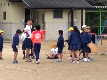 今日の業間は、縦割り遊びでした。これは縦割り掃除と同じ班で、縦割り掃除期間に1回設定されています。上級生がリーダーとなり、自分たちで決めた遊びをするのですが、ドッジボールと「どろけい」をしている班がほとんどでした。ドッジボールでは、低学年にボールを回してあげたり、手加減してボールを投げたりしてくれる優しい上級生がいました。また「どろけい」で上級生に追いかけられる下級生の全力疾走がすごい。これを毎日やったら、足が相当速くなるのではと思いました。