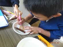 5年生は外国語活動で「What would you like?」「I'd like ~~.」の勉強をしており(以前の日記「教科等研究会(外国語活動)の研究授業」を参照)、実際に先生たちに英語でメニューを聞いていたのですが、今日、そのオーダーした料理を届けてくれました。とは言え、本物の料理はできないので、絵に描いた料理とサービスのデコレーションしたクッキーを、「Here you are.」と届けてくれました。このように子供たちが楽しく英語が身に付くよう、バレリア先生の力も借りて様々な工夫をしていただいています.。有り難いことです。
