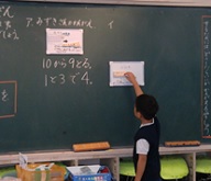 いよいよ繰り下がりのあるひき算の学習を始めました。初めの時間は、「かきが13こなっています。9こたべると、なんこのこりますか」という問題でした。どんな計算の仕方をすればいいのかを、一人ひとり自分でブロックを使いながら考えました。10と3に分けて置いたブロックのどこから、ブロックを動かして9を取るのかを→や言葉を使ってホワイトボードに表しながら考えました。ブロックの動きを表すことは、難しいですが、自分の考えを残すこともできるし、自分の考えを整理することもできるので、少しずつ練習しています。8分間でできたところまで書いて、9をどこからとったかをペアの友達に話しました。考えたことを話すことも自分の考えをよりはっきりさせることができます。ペアで発表した後は、全体に発表です。実際にブロックを動かしながら説明しました。子どもたちの考えは、2つに分かれました。「10から9をとる。のこった1と3で4」という考えと、「13から3をとって10。10から6をとっ4」の2つです。どちらも答えは同じ「4」だから、どちらの考えも〇。違いは、9のとり方ということもわかりました。学習のふりかえりまでで、2時間かかったので時間はかかりましたが、どうすれば9を引けるのかを教えられるだけではなく、活動しながら自分で考えることができたことが楽しかったようでした。