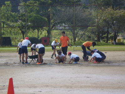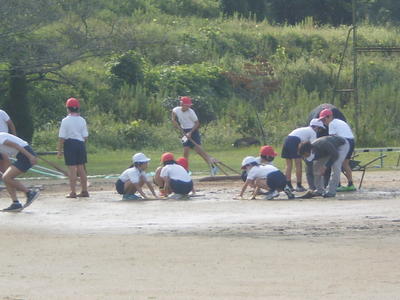本来予定していた24日は、雨のため順延となり、25日に実施しました。当日は朝方まで降り続いた雨のため、運動場にはたくさんの水たまりが。開始時間を1時間遅らせて、4~6年児童と教職員で、スポンジで水を吸ったり、砂を入れたり、ならしたりと運動場整備を行いました。黙々と作業をする児童の姿が頼もしく、とても嬉しくなりました。
