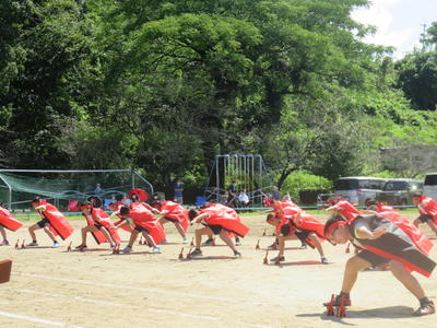 運動会は、各学年の徒競走、全学年での大玉転がし、上学年・下学年の表現(ダンス)、応援合戦、低中高に分かれてのリレーを行いました。どの競技も、一生懸命に取り組むことができました。