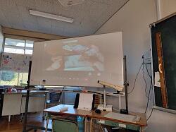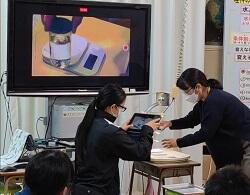 その成果もあり、食塩での実験はすべての班でうまくいき、「もののとけ方」の性質に気付くことができました。また、最後に笠原教諭が手元を、タブレットを用いてリアルタイムで拡大・投影し、ミョウバンの演示実験を行いました。