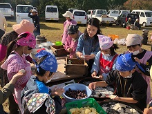 いきなり団子作りが始まりました。数えてみると参加されている地域の方や保護者の数が児童数と変わりません。「こんなに地域に支えたれた学校は、日本国中探してもなかなか見つからない」と思います。また、同じいきなり団子でも、地区によって微妙に作り方や形、大きさが違うのがおもしろいなと思いました。