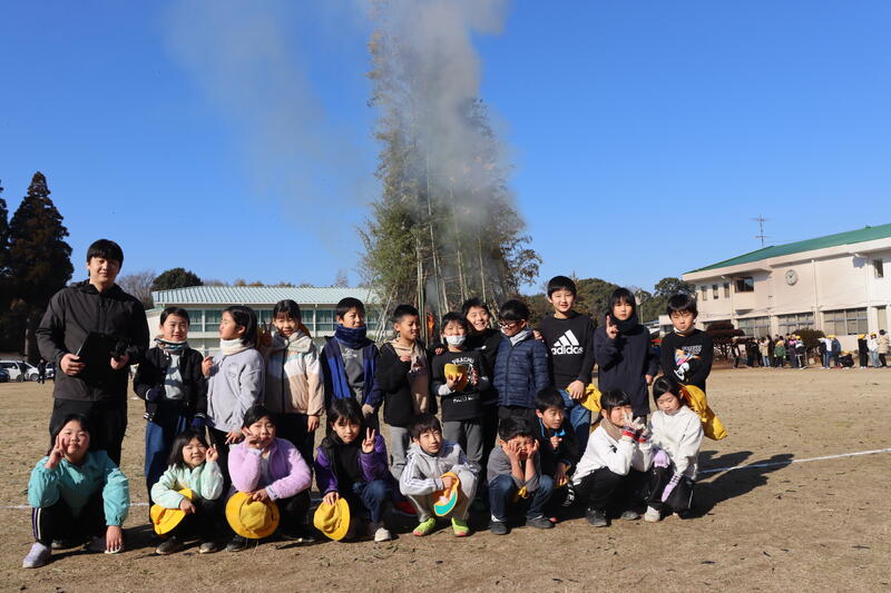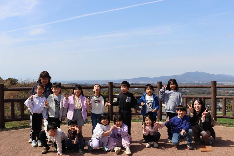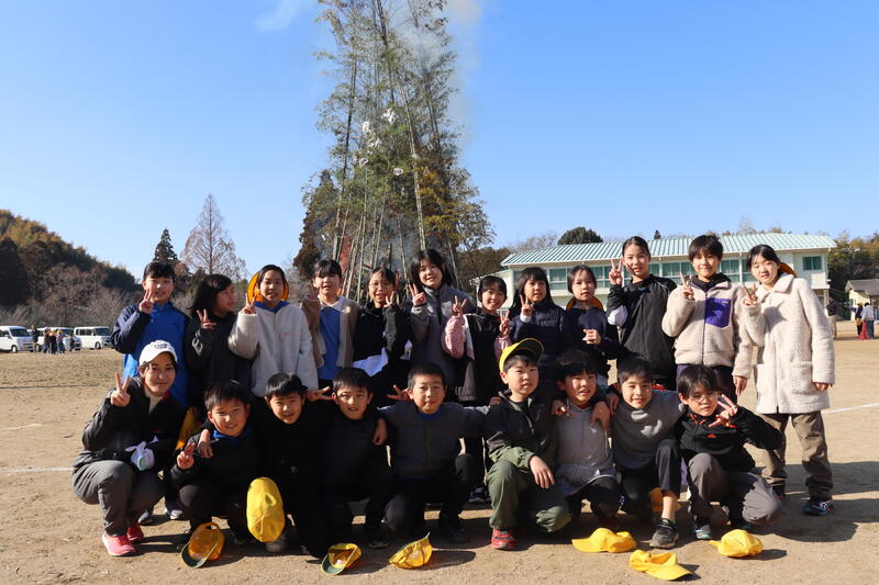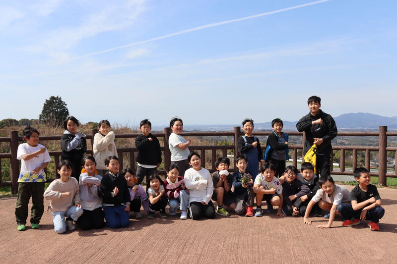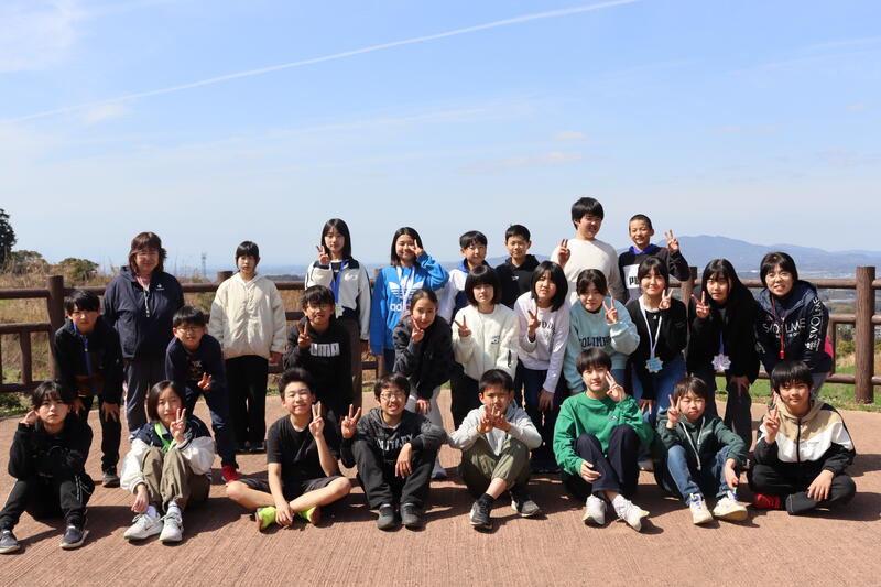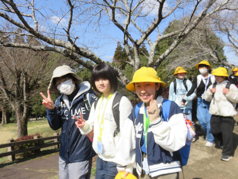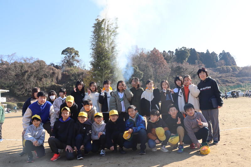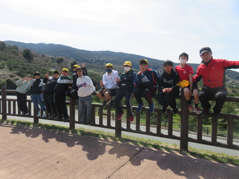 最後はみんなでハイチーズ!梅の花の白をバックに玉東カラーのオレンジと緑が映えています。6年生のみんな、学校のためにありがとう!