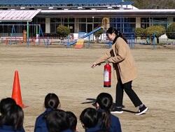 19日に火災避難訓練を行いました。今回は水消火器による模擬消火です。火事現場を発見したときの対応から消火器の使い方までを職員代表と児童代表が実践しました。