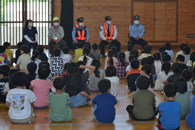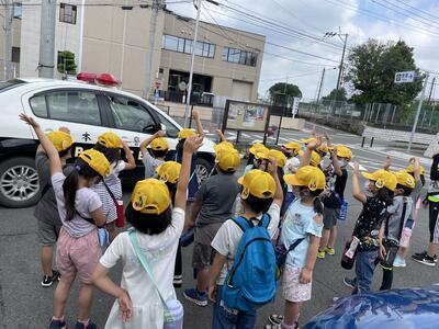 次に、横断歩道での渡り方を実際にやってみました。みんな、手をピンとあげて横断できていました! 最後に駐在所の山下さんから、「自分の命を守るために、今日教えてもらったことをしっかりとできるようになろうね」と話をしていただきました。