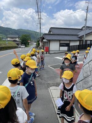 今週火曜日、5月31日に1年生2クラスの子供たちは、学校から歩いて役場周辺まで村探検を行いました。これは、生活科の通学路を歩く学習の一環で、役場の隣にある山河の館(西原村図書館)や駐在所を訪問しました。どんなもの(建物)があるか、どんな人(働く人)がいるかを見付けながら歩きました。通り道では、サツマイモ畑や栗の木、道路標識、いろいろなお店など目を輝かせながら見ていました。西原保育園では、先生方との再会を喜ぶ声も上がっていました。中には、「懐かしい~~」と言葉をもらす子もいたようです。(まだ2ヶ月だよ~~。でも、きっとホントに懐かしかったんでしょうね!)