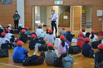 5時間目に、西原村の交通安全協会と駐在所から来ていただき、1・2年生を対象とした交通安全教室を体育館で行いました。最初は、交通安全協会の方から基本的な交通ルールや道路の横断の仕方などをプレゼンを使って教えていただきました。道路を歩くときの「は・ひ・ふ・へ・ほ」は、みんなしっかり覚えたようです。