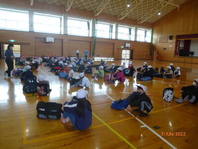 学校前の横断歩道を渡るときから、「校長先生、今日から集団宿泊教室です!」と大きな荷物を指さしながら楽しそうに話してくれました。朝8時までに体育館に集合した子供たち。担任の兼本先生から諸注意を受けた後、私からは子供たちに「3つのことをこの2日間頑張ろう」と話しました。
